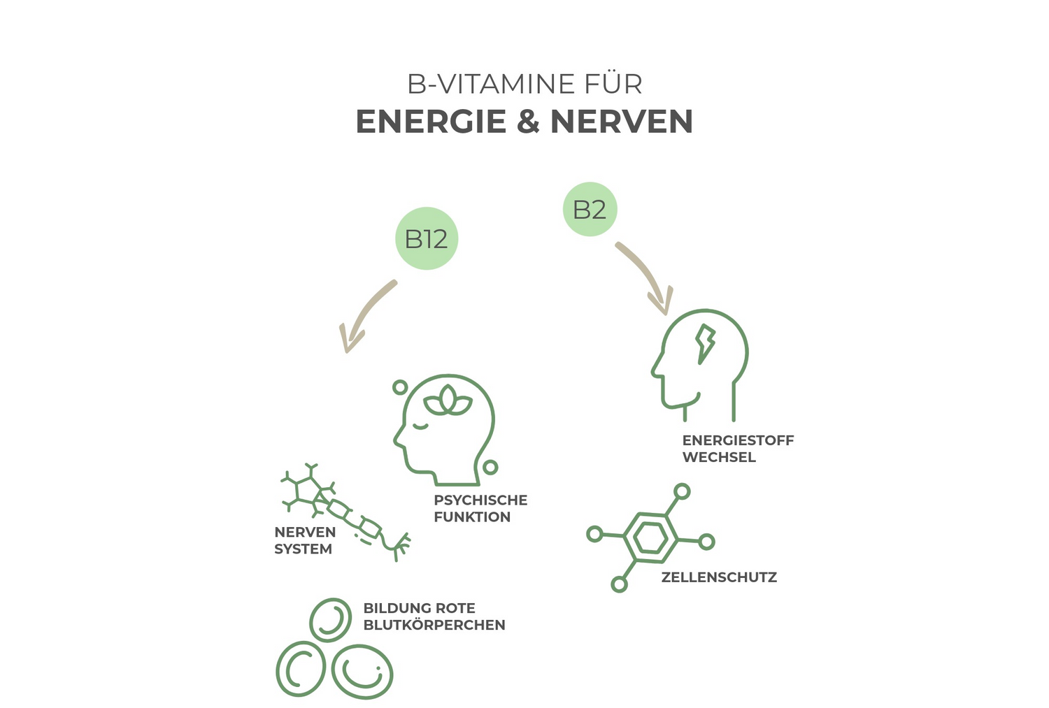 Weil sie sich optimal ergänzt: D3 hilft bei der Calciumaufnahme, K2 bringt das Calcium in die Knochen. B12 wirkt gemeinsam mit B2 auf Energiestoffwechsel, Nerven und Zellschutz.